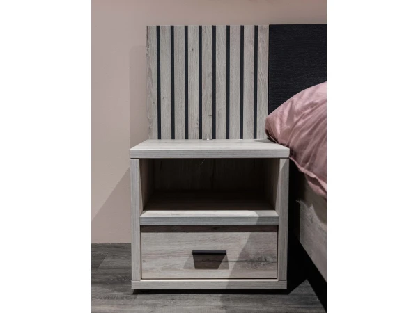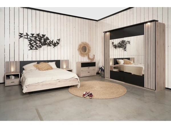 Ontdek de harmonieuze Lima collectie van Meubar en creëer een samenhangende en stijlvolle slaapkamer. Het 2-persoonsbed met zwart hoofdbord en licht eikenhouten afwerking straalt moderniteit uit. De bijpassende nachttafeltjes vormen een naadloze uitbreiding van het bed, waardoor een uniforme en evenwichtige uitstraling ontstaat. Met deze set haal je niet alleen comfort, maar ook esthetiek in huis!