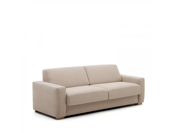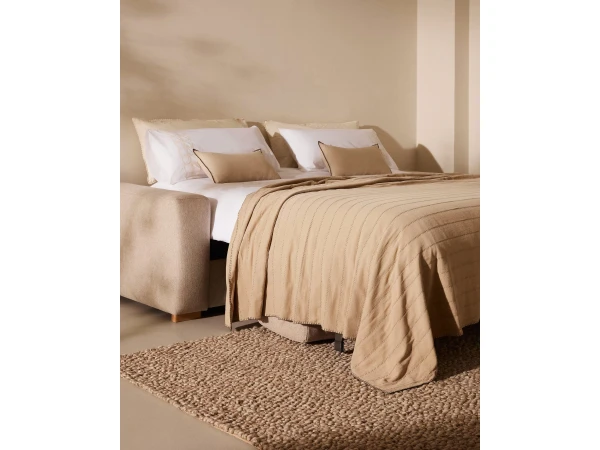 De 3-zits zetelbed Anley van Kave Home is stijlvol, comfortabel en zeer duurzaam. Anley heeft een gestructureerde beige stoffen bekleding, massief beukenhouten poten en een eenvoudig Italiaans openingsmechanisme. De afneembare bekleding en het 16 cm dikke visco-elastische matras zorgen voor gemak en comfort. De zetel is lokaal geproduceerd met ambachtelijke processen, waardoor de CO2-uitstoot wordt verminderd. De poten zijn gemaakt van duurzaam FSC-gecertificeerd hout. Upgrade je interieur met zetelbed Anley en geniet van stijl, functionaliteit en duurzaamheid in één!