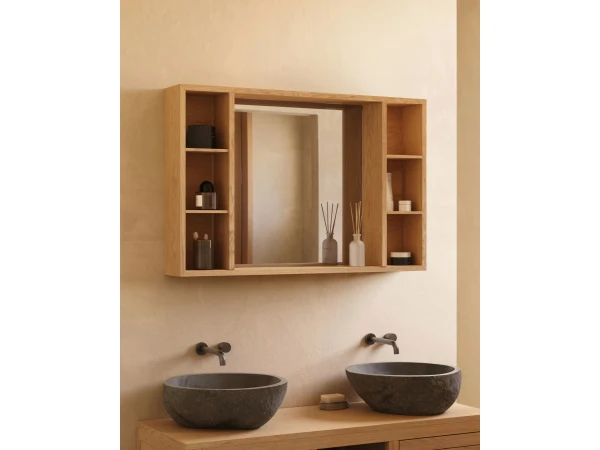 Badkamerkast met spiegel Kenta beschikt over 3 planken aan elke kant. Je kan dus makkelijk al je verzorgingsproducten zorgvuldig opbergen. Combineer de spiegel met de rest van de collectie om zo een mooi geheel te creëren!