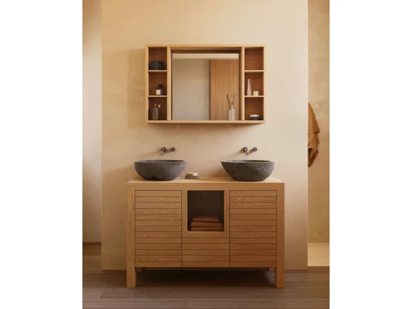 De Kenta collectie van Kave Home is een prachtige collectie van stijlvolle en tijdloze badkamermeubelen. De meubelen zijn gemaakt van vochtbestendig massief teakhout. Doordat ze gemaakt zijn van natuurlijke materialen, is elk stuk exclusief. Zo hebben ze elk unieke tonen en nerven. Het hout is afkomstig uit duurzame bossen met een gecontroleerde houtkap.