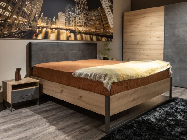 Om de slaapkamer helemaal af te maken stellen we ook het bedkader Tampa voor. Het bed houdt zijn strakke vorm. Door het gestoffeerde hoofdbord krijgt het bed een stoere industriële look.