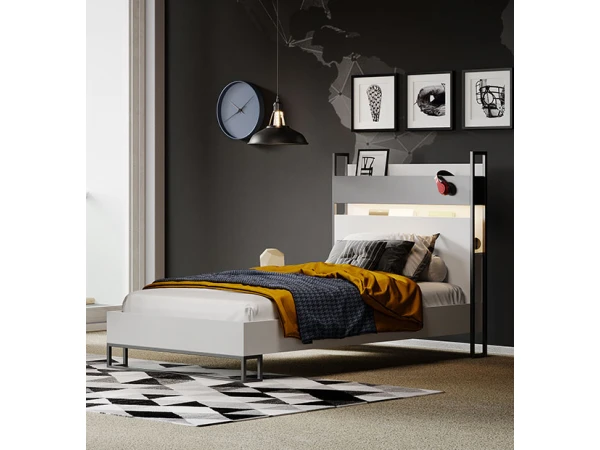Bed Legend is geschikt voor een matras met afmetingen 90 x 200 cm, een standaardmaat voor jeugdkamers dus. Je kan indien gewenst ook andere afmetingen kiezen! Dit bed heeft een prachtig hedendaags design waarin de kleuren wit en antraciet centraal staan. Het hoofdbord is bovendien super praktisch ingericht waardoor je het kan gebruiken voor decoratie en om spullen op te bergen. Handig!