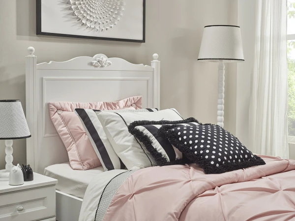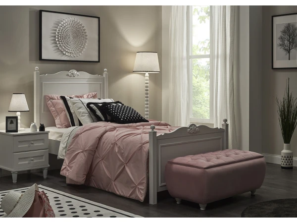 Bed Lora is een prachtig wit meisjesbed in de landelijke stijl, afgewerkt met sierlijke details. Je meisje zal zich als een echte prinses wanen in dit prinsessenbed! Onder het bed is ruimte voorzien voor een bedlade die je kunt gebruiken als logeerbed of voor extra opbergruimte. Bijhorend is er ook een opzetstuk beschikbaar om van het bed een mooi hemelbed te maken, voor nog meer prinsessengehalte! Dit bed is verkrijgbaar in twee formaten, met breedte 90 of 120 cm.