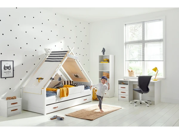 Deze prachtige bedlade past perfect onder het tipibed van Cool Kids. De grote bedlade biedt heel wat opbergruimte en is zo ideaal voor het opbergen van heel wat spullen. Je kan er ook voor kiezen om een matras in de bedlade te leggen, zo heb je meteen een extra slaapplek. Ideaal wanneer er vriendjes blijven slapen. Deze bedlade is uitgerust met wieltjes en 2 lederen grepen, zo kan je kind de bedlade eenvoudig van onder het bed schuiven. Bovendien zien deze lederen handgrepen er ook gewoon prachtig uit. De bedlade is uitgevoerd in mooi afgelakt MDF.
