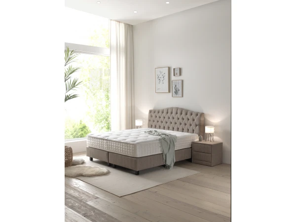 Deze boxspring met stoffen gecapitonneerd hoofdbord heeft een uitermate landelijk karakter. Deze boxspring komt incl. matras Deluxe met hoogte 30 cm. Deze luxueuze matras met pocketveren zorgt voor een aangenaam ligcomfort en een ergonomische slaaphouding. Deze landelijke boxspring komt het best totzijn recht in een landelijke slaapkamer.