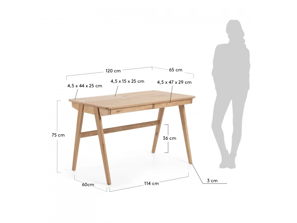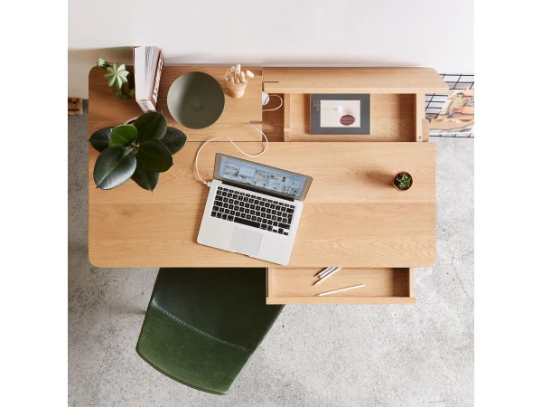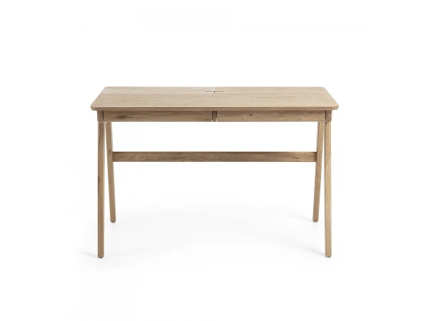 Dit bureautje is echt een kanjer! De twee kleppen die langs boven openen doen ons ongetwijfeld terugdenken aan vroeger. Toch kreeg deze bureau een moderne look in zacht essenhout zodat hij past in elke interieurstijl. Binnen het bureau vind je zowel langs boven als langs onderen een subtiele uitsparing voor kabels. Het bureau heeft onder het werkblad twee schuiven om je spullen op te bergen.