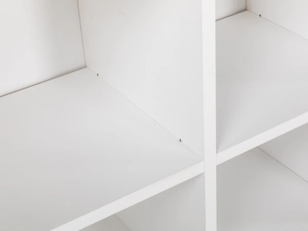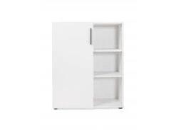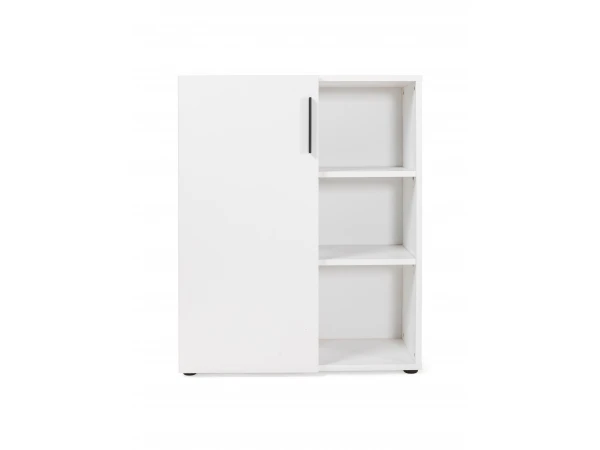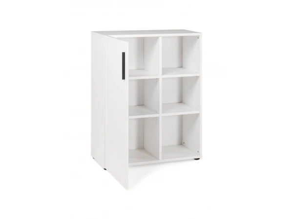 Het assortiment bevat: een open witte en een zwarte boekenkast, een brede witte kast, een aanbouwstuk voor een bureau, een bureau, rolcontainer en een brede lage witte kast.