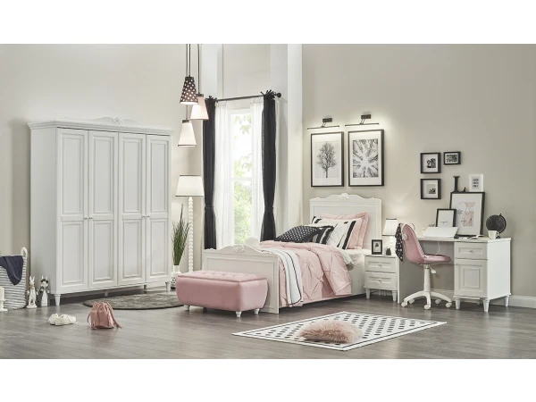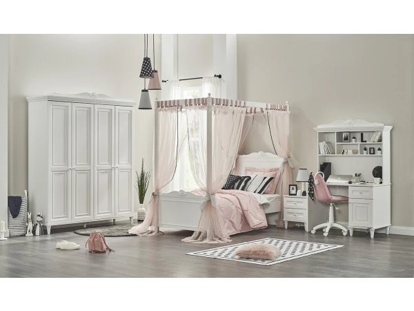Deze roze met witte bureaustoel Naz staat prachtig bij kinderkamer Lora. Deze meisjes bureaustoel maakt de prinsessenkamer helemaal af! Het witte onderstel past zeer goed bij witte meubelen, maar eigenlijk staat deze bureaustoel prachtig in elke kinderkamer.