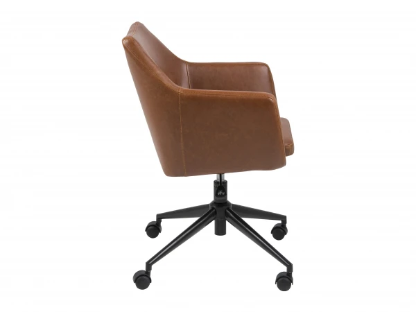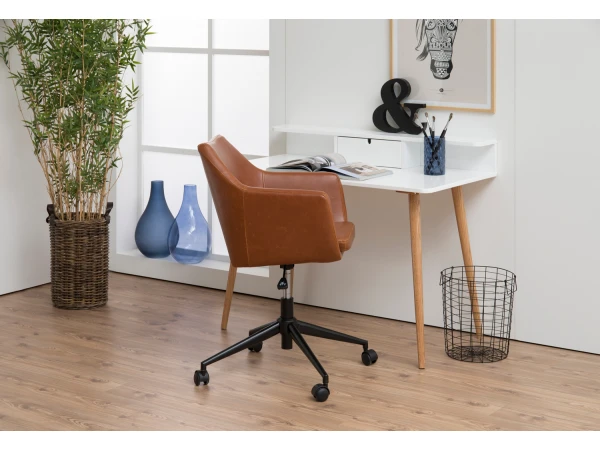 Deze uitvoering van bureaustoel Nora is een stijlvolle bekleding in bruine of zwarte lederlook, met zwart metalen onderstel. Ideaal voor aan de computertafel of aan je bureau. Zijn hoge rugleuning en zachte zitkussen maken hem extra comfortabel. Deze moderne bureaustoel met tijdloze looks past in elk interieur!