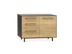Deze commode uit de cosy collectie biedt met zijn deur en 3 lades genoeg opbergruimte aan. De stoere zwart metalen handgrepen maken het geheel helemaal af.
