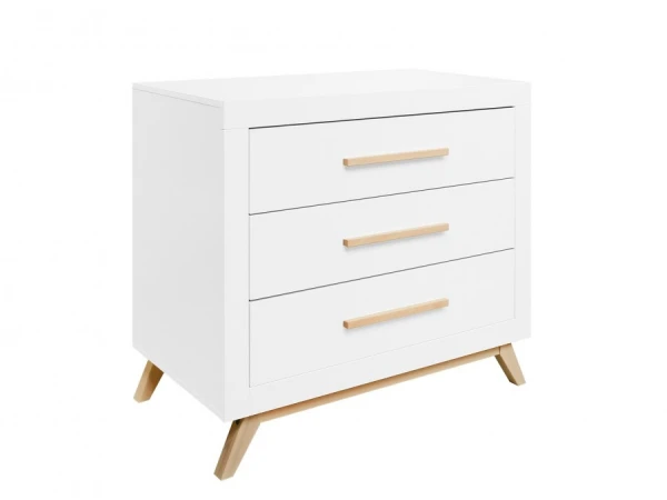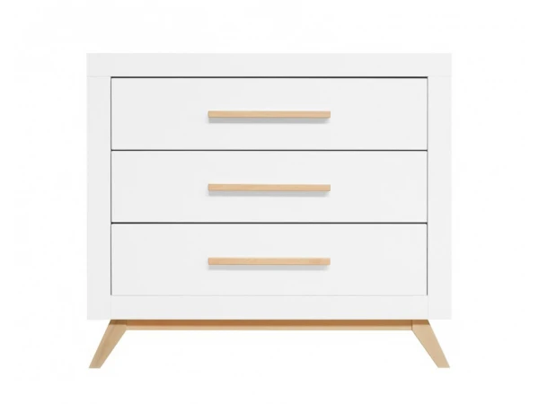 Fenna is een moderne baby- en kinderkamer. De combinatie van gelakt wit hout met naturel beukenhouten pootjes zorgt voor een eigentijdse en Scandinavische look. Deze commode heeft drie ruime lades waar je veel in kunt opbergen. Combineer deze commode met de barrier square voor het eenvoudig verschonen van de baby. Plaats het wandrekje Fenna boven deze commode voor nóg meer opbergmogelijkheden. Combineer deze commode met de andere meubels van de collectie Fenna voor een mooie uniforme slaapkamer.