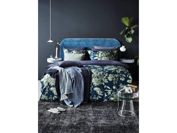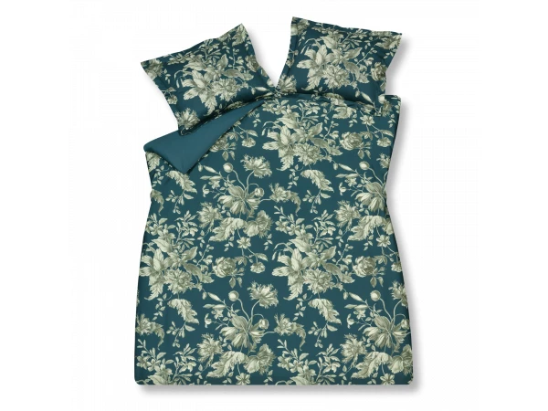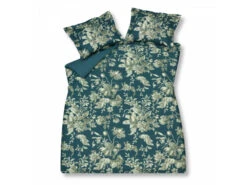 De donkerblauwe achtergrond van dekbedovertrek Bloom Art night blue is versierd met weelderige bloemen en planten in bleekgroene tinten. De achterkant van het dekbedovertrek is effen blauw van kleur. De kussens hebben bloemen en planten in het midden. De Bloom Art night blue heeft een luxe uitstraling door de betoverende bloemen en chique kleuren.