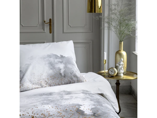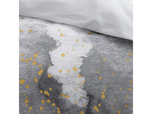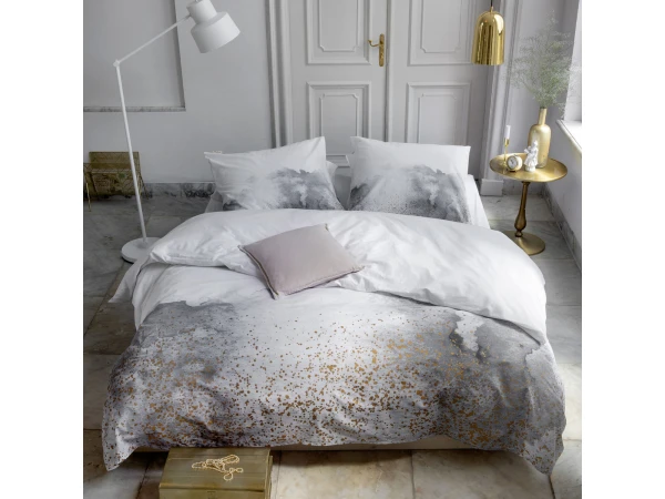 Dat een aquareldessin ook stoer kan zijn is uitstekend terug te zien in dit dekbedovertrek. Uitgevoerd in prachtig grijs en met een eigenzinnige afwerking door de luxe gouden spots. De achterzijde van het overtrek is sereen wit. Dat maakt van het stoere ontwerp een kalm toevluchtsoord na een lange dag.