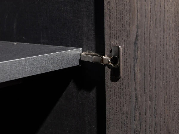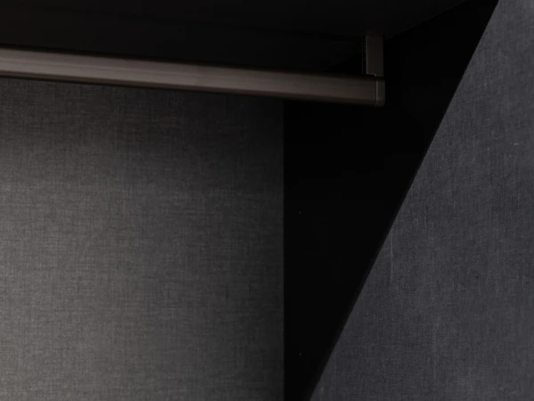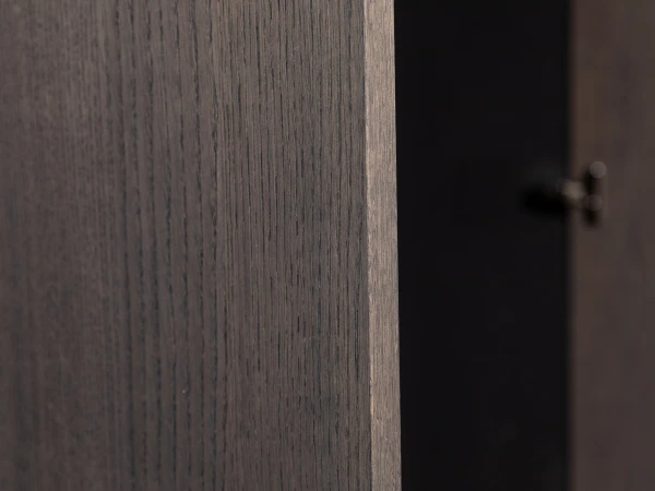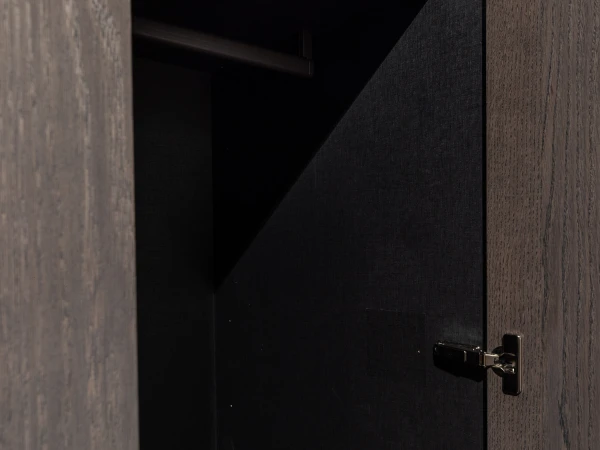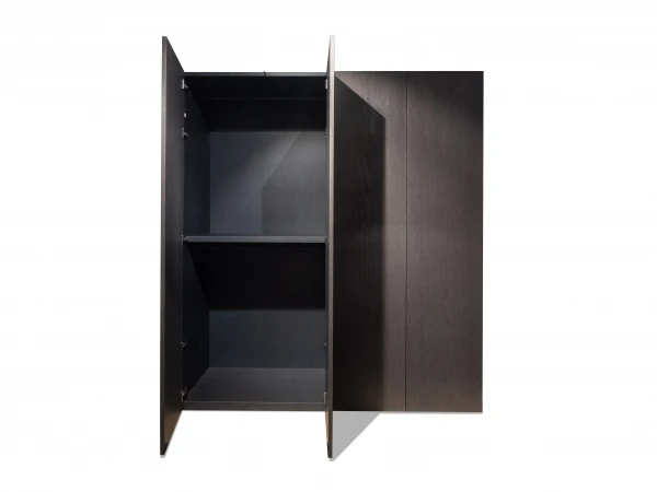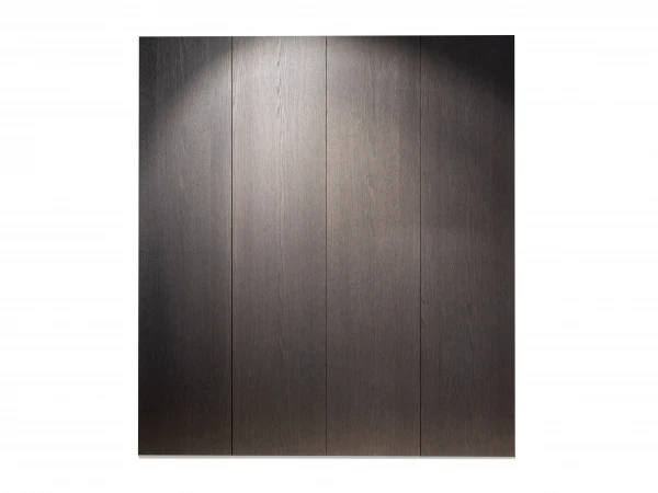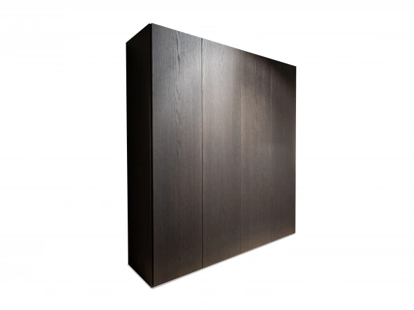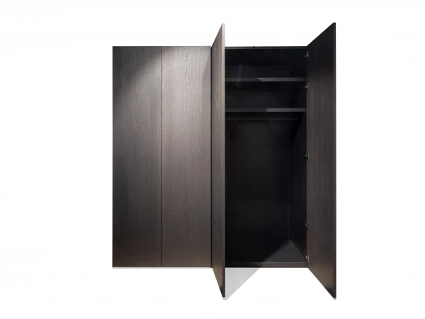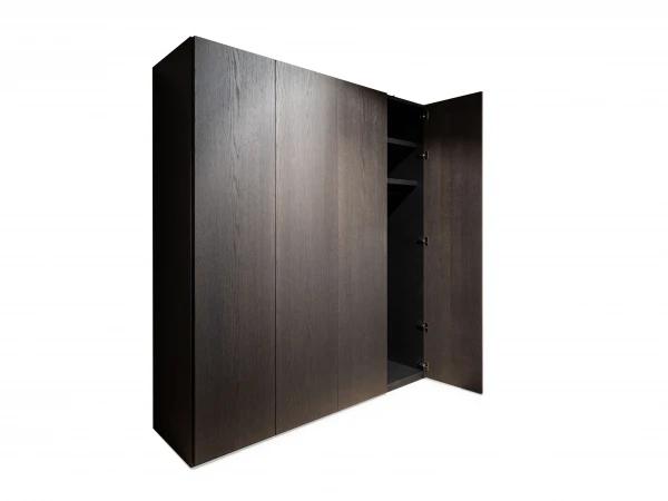 Aanschouw hier de prachtige draaideurkast Alpha van Novamobili. Deze kast heeft 4 draaideuren en kun je eenvoudig openen met een push-pull systeem. Zo straalt de ruimte één en al sereniteit uit en komt de donkere eikenfineer mooi tot zijn recht. In het linkse gedeelte van de kast heb je twee open vakken. Het rechtse gedeelte beschikt over twee leggers en een roede om al je kledij netjes in weg te bergen of aan te hangen. Modern, strak en stijlvol, zo kunnen we deze Alpha-kast benoemen.
