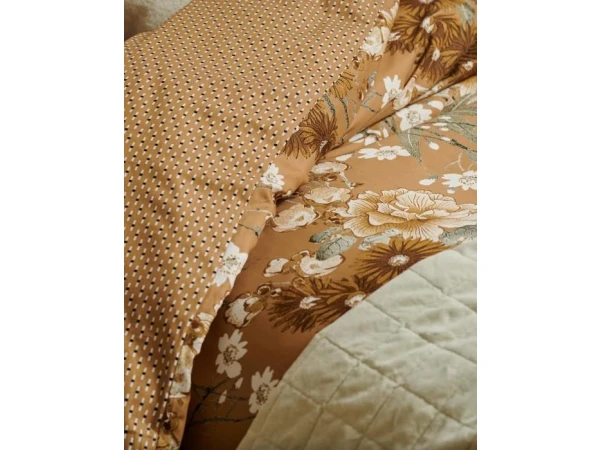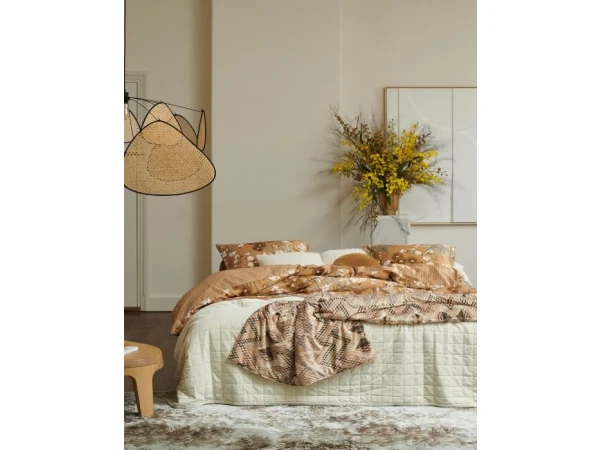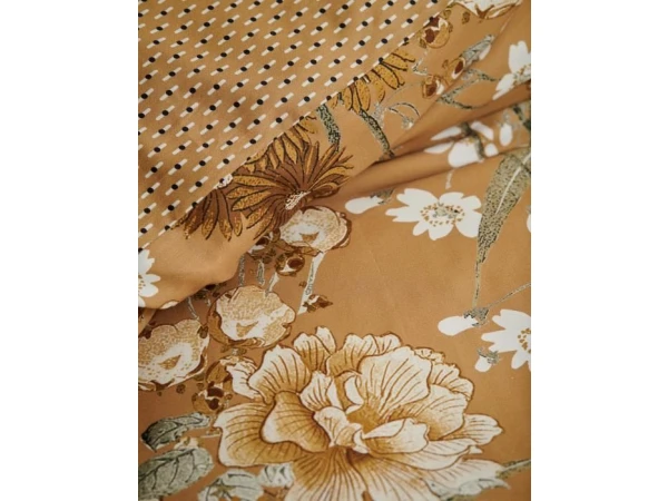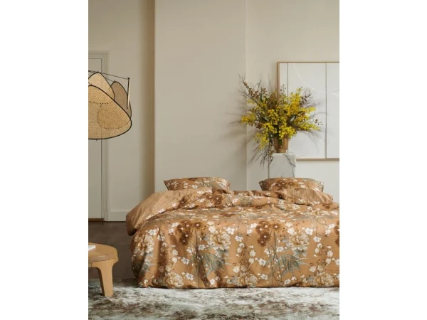 De Charlize cashew wordt getypeerd door haar vernieuwende contrasterende design. Dit unieke dekbedovertrek heeft zich het mix & match principe eigen gemaakt en in één design geïmplementeerd. De rijke bloemenprint in zachte bruin- en aarde tinten laat de lichte bloemen tot leven komen. De print met bloesemachtige bloemen is geïnspireerd op 17e-eeuwse stillevens met Japanse invloeden. Deze bloemenweelde krijgt een moderne touch door het dessin wat aan de andere kant van het dekbedovertrek is gebruikt: meer grafisch, wat zorgt voor een frisse look. De glans van het katoen satijn laat de twee prints op een natuurlijke manier in elkaar overlopen en voelt heerlijk zacht aan de huid. Het overtrek werkt prachtig in een neutrale lichte omgeving en creëert in combinatie met beige tinten een bijna zonnige gloed in de ruimte.