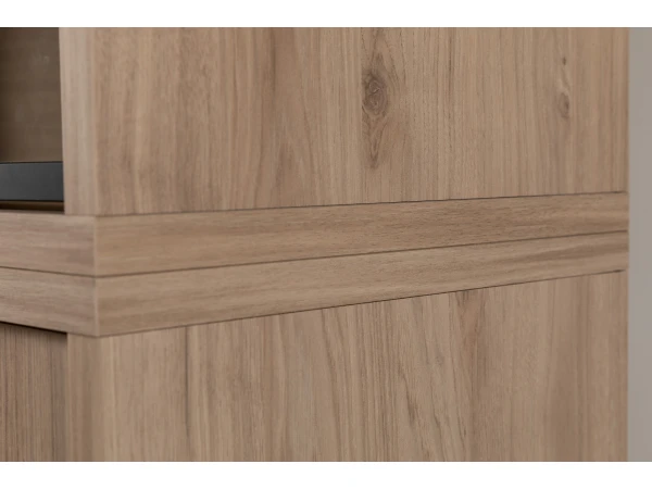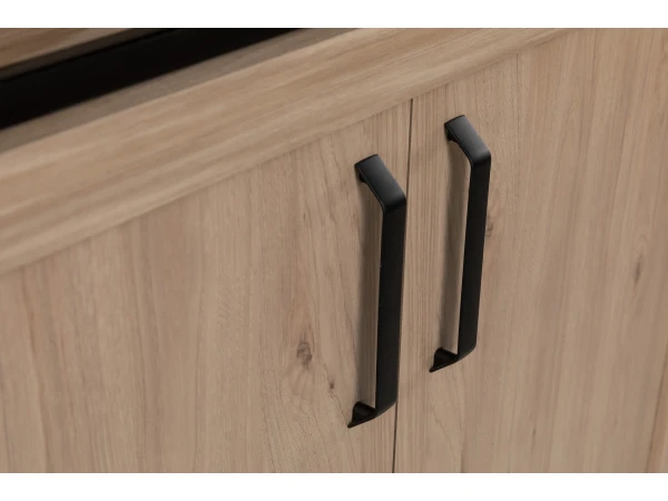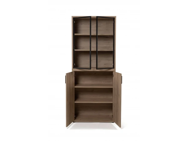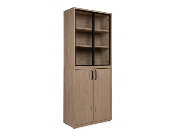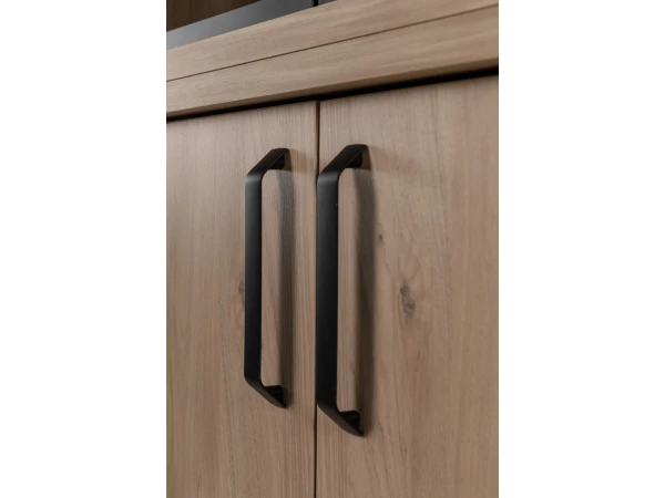 Deze hoge bureaukast heeft zowel een kastgedeelte als een vitrinegedeelte. Een ideale manier om zaken op te bergen en uit te stallen. Deze hoge bureaukast met glasdeuren is uitgevoerd in eiken met zwarte greepjes, wat zorgt voor een moderne uitstraling. Combineer met de andere meubelen uit de Bizzy collectie, voor een uniform geheel.