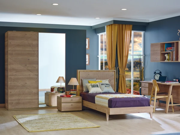 Jeugdkamer Origami beschikt over een erg bijzondere stijl, met een design geïnspireerd door de Japanse papiervouwkunst. Deze slaapkamer pakt uit met een uniek patroon in al haar meubelstukken en een uitvoering met een warme, blanke eiken look in melamine. De fijn afgewerkte details en geometrische lijnen maken van deze kamer echt een plezier om naar te kijken. Laat staan het slapen, opstaan en studeren in deze ruimte! Wat een feest. Beter nog, deze slaapkamer bevat een schuifdeurkast die volledig voorzien is van legplanken, kledingroedes én ingebouwde ledverlichting.