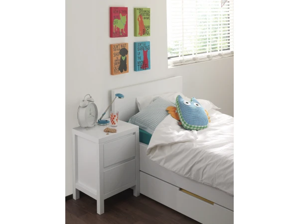 De serie Camille van Bopita is een tijdloze baby- en tienerkamer in wit gelakt hout. Deze kinderkamer in wit straalt ongetwijfeld rust en vrolijkheid uit. Bed Camille heeft een opvallend robuuste belijning, een hoog hoofdeinde en laag voeteinde. Dit bed komt inclusief lattenbodem en is geschikt voor een matras van 90 op 200 cm. Verder beschikt het bed nog over een set van 2 laden van model Corsica en een nachtkastje Camille met 2 soft-close laden. De wieltjes zijn bijgeleverd. Als je het als nachtkastje gebruikt, kunnen de wieltjes gedemonteerd worden.