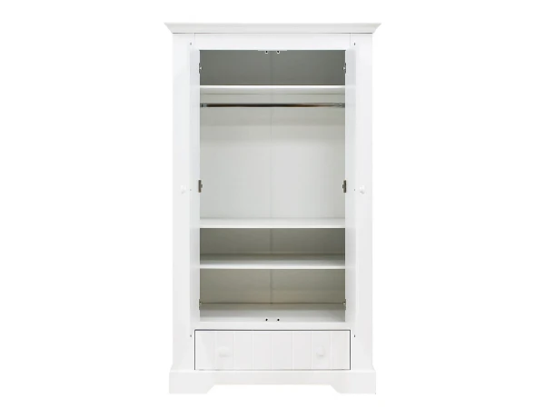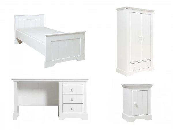 Narbonne is een landelijke slaapkamer van Bopita. Met de moderne, witte MDF afwerking heeft het gezellige ontwerp toch iets fris en vernieuwend rond zich. Deze volledige slaapkamer bevat het eenpersoonsbed Narbonne voor matrasmaat 90 x 200 cm. Hiernaast is er de tweedeurskast die reeds volledig voorzien is van legplanken en hangroedes. Hierbij krijg je dan ook de Narbonne bureau en het nachtkastje met een draaideur. Specifiek bestaat de slaapkamer uit: