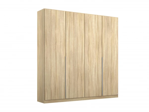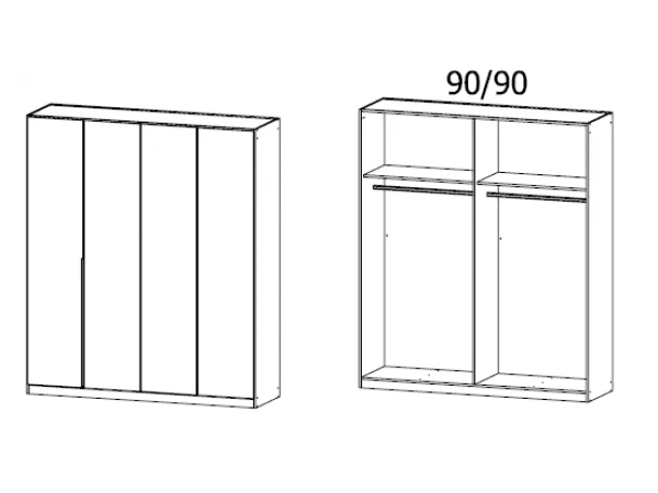 Deze ruime kleerkast heeft een neutrale houtskleur en past in zowat elk interieur. De indeling van de kleerkast bestaat uit 2 compartimenten, per compartiment is er standaard een legplank en een hangroede inbegrepen. Zo heb je voornamelijk ruimte voor kapstokken, en ook nog schapruimte bovenaan. Deze kleerkast heeft vier draaideuren. Twee deuren van de kleerkast zijn afgewerkt met een elegante aluminium greep.
