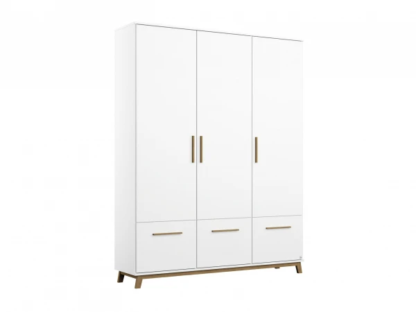 Deze kleerkast heeft 3 draaideuren met vanbinnen een hangroede en diverse legplanken. Onderaan heb je nog 3 laden voor extra opbergruimte. De houten poten zorgen voor een elegante uitstraling. Met de bijhorende slaapkamer meubelen vorm je jouw slaapkamer om tot een pareltje!