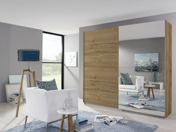 Kies voor schuifdeuren in een uniforme kleur, of ga voor een stijlvolle spiegeldeur of glasdeur voor een modernere look. In het unieke, trendy kleurenpalet vind je ongetwijfeld jouw smaak. Wij kozen alvast deze natuurlijke kleerkast in wotan eikenlook met spiegeldeur. Ideaal voor elke slaapkamer!