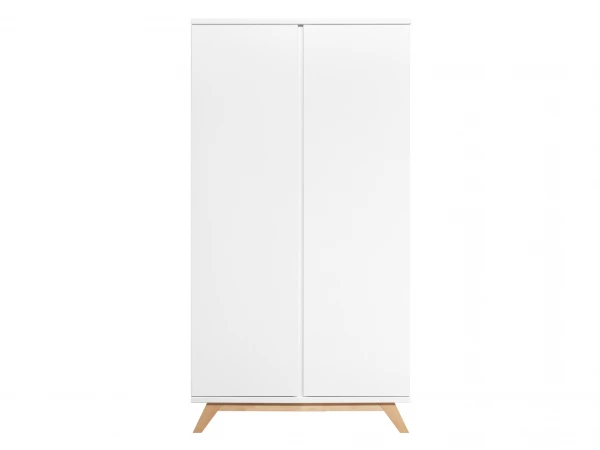 De kleerkast Lynn met 2 deuren is nu ook greeploos te bestellen! In de combinatie van wit gelakt MDF hout met blank houten schuine poten. De kast is volledig ingedeeld, voorzien van legplanken, een hangroede en voorgeboorde gaatjes waardoor je zelf je plankjes in hoogte kan verstellen. Geschikt voor de tienerkamer en de babykamer.