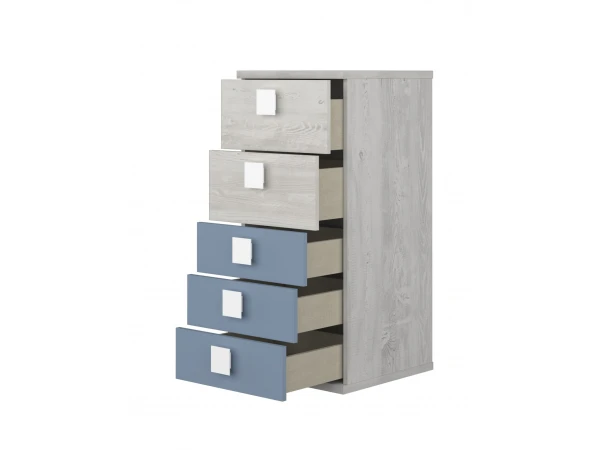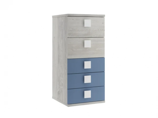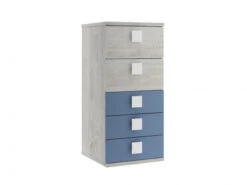 Deze mooie ladekast hoort bij de jeugdkamer Jules en is verkrijgbaar in meerdere leuke kleuren! Deze ladekast is telkens afgewerkt in een bleke houtkleur met een bijpassend kleurtje dat je zelf kan kiezen. Qua indeling is deze commode voorzien van twee brede laden bovenaan en drie smalle laden onderaan. Praktisch! Combineer met hoogslaper en bureau Jules voor een prachtig geheel. Ontdek meer online of in onze showroom!
