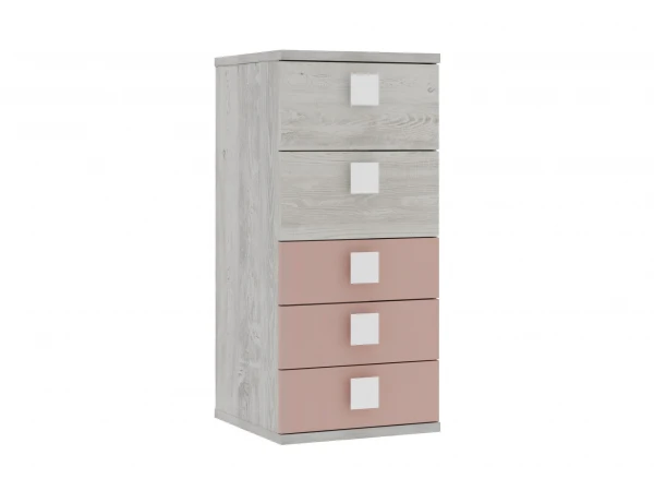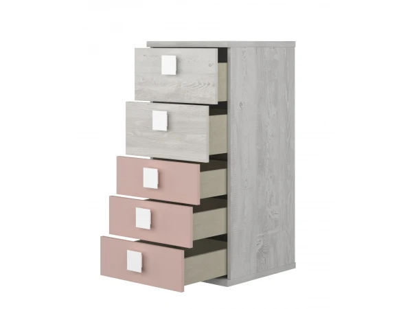 Deze mooie ladekast hoort bij de jeugdkamer Jules en is verkrijgbaar in meerdere leuke kleuren! Deze ladekast is telkens afgewerkt in een bleke houtkleur met een bijpassend kleurtje dat je zelf kan kiezen. Qua indeling is deze commode voorzien van twee brede laden bovenaan en drie smalle laden onderaan. Praktisch! Combineer met hoogslaper en bureau Jules voor een prachtig geheel. Ontdek meer online of in onze showroom!