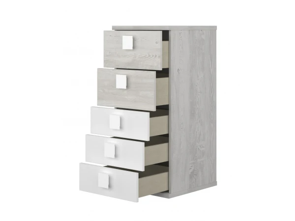 Deze mooie ladekast hoort bij de jeugdkamer Jules en is verkrijgbaar in meerdere leuke kleuren! Deze ladekast is telkens afgewerkt in een bleke houtkleur met een bijpassend kleurtje dat je zelf kan kiezen. Qua indeling is deze commode voorzien van twee brede laden bovenaan en drie smalle laden onderaan. Praktisch! Combineer met hoogslaper en bureau Jules voor een prachtig geheel. Ontdek meer online of in onze showroom!