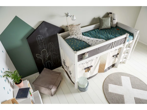 Wie bij cactus enkel denkt aan pijnlijke stekels, heeft dit bed nog niet gezien! Het bed heeft het stoere thema Cactus gekregen en vormt een fantastische plek voor kinderlijk slaapavontuur. De halfhoogslaper kenmerkt zich door witte en grijze tinten met getekende vlaggetjes en cactussen. Lifetime biedt altijd comfort, speelsheid, originaliteit en praktische details. Zo kun je de halfhoogslaper later weer ombouwen tot een laag basis kinderbed.