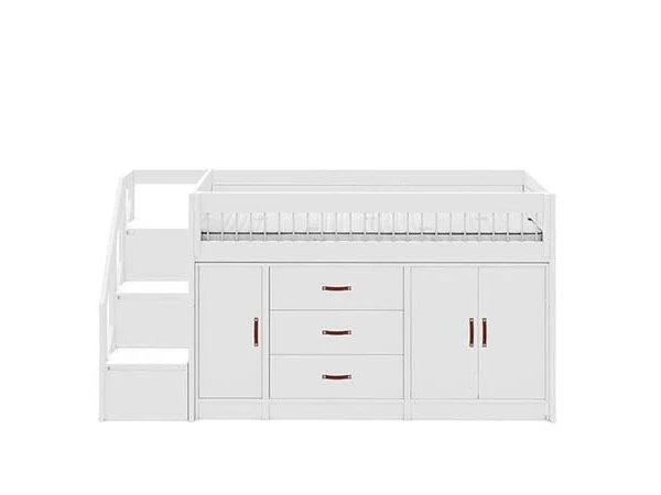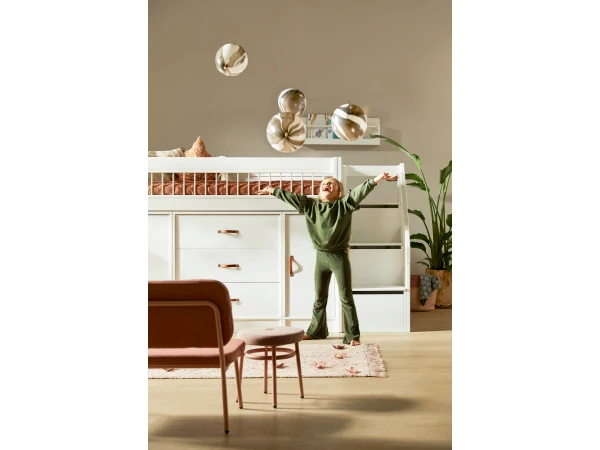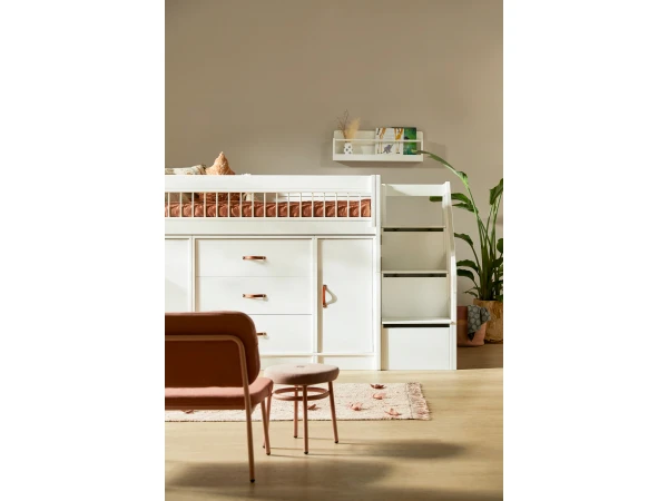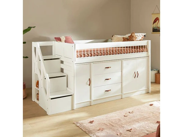 Dit all-in-one beddensysteem komt met een handig en flexibel opbergsysteem, waarbij je verschillende opbergmodules kunt combineren. De modules zijn op kinderhoogte, zo kan je kind makkelijk bij zijn eigen kleding. In de treden van de trapladder kun je ook gerust wat spullen kwijt. Het bed werd witgelakt en uitgevoerd in massief knoestvrij grenen en MDF. In de kleur whitewash wordt enkel massief grenen met noeststructuur gebruikt.