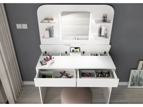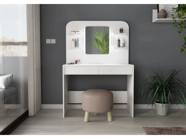 Deze make-up tafel in wit vormt een pareltje in de kinderkamer! Een echte eyecatcher waar je kind alle leuke spulletjes kan opbergen. De led strips rond de spiegel geven de schminktafel een echt stergehalte. We verkopen dit make-up tafeltje nu als toonzaalmodel, haast je want op = op