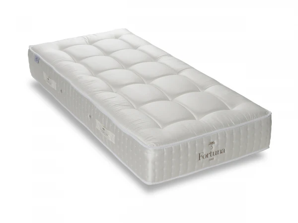 De hoes van de Fortuna matras is een handgenopte matras met damast doek. De doorstikking met wol/wildzijde zorgt voor een zalig contact en toch een progressieve ondersteuning. De matras wordt afgewerkt met handvaten, borduring en ventilatiegaten.