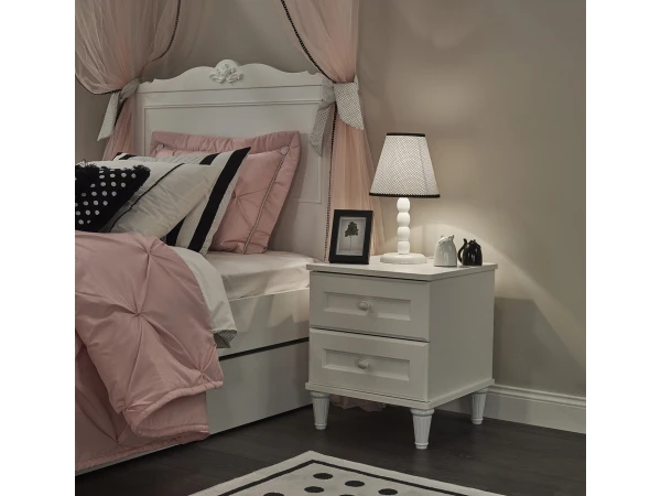 Dit wit nachtkastje in landelijke stijl maakt jouw kinderkamer in prinsessenthema compleet! Het nachtkastje is prachtig afgewerkt tot in de kleinste details, met sierlijke elementen en vrolijke pootjes. Het nachtkastje heeft twee laden voor extra veel opbergruimte. Een mooie aanvulling voor bed en kinderkamer Lora, enkel voor kleine prinsessen!
