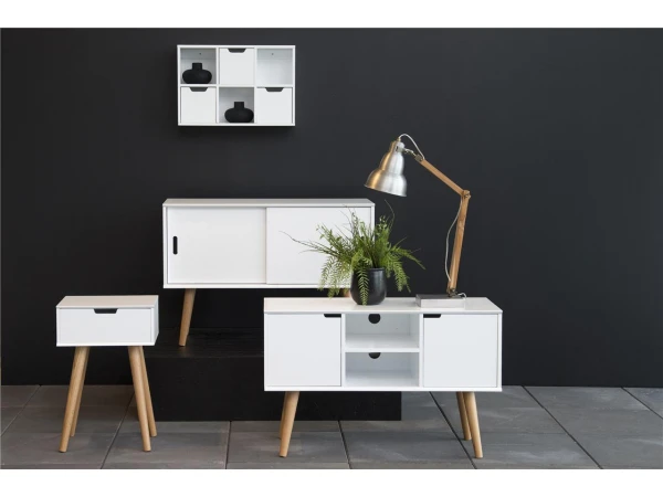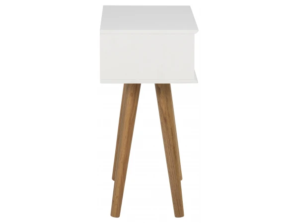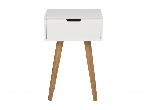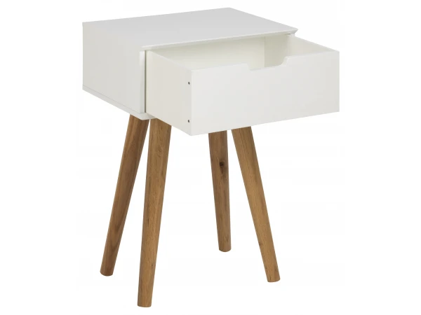 Nachtkastje Mitra is een elegant nachtkastje met lange houten poten in de Scandinavische stijl. Het nachtkastje heeft 1 lade om je spullen in op te bergen. Dit tijdloze, moderne nachtkastje staat prachtig in je slaapkamer en zorgt voor een mooie eyecatcher.