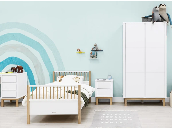 Kenmerkend voor de serie Mika zijn de eikenhouten accenten en subtiele afrondingen. De meubels zijn uitgevoerd in een combinatie van mat afgewerkt eiken en wit gelakt MDF. Deze lak is op waterbasis en daardoor kind- en milieuvriendelijk.