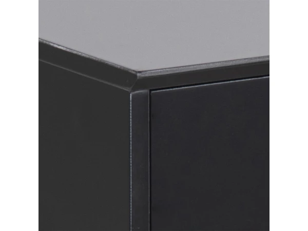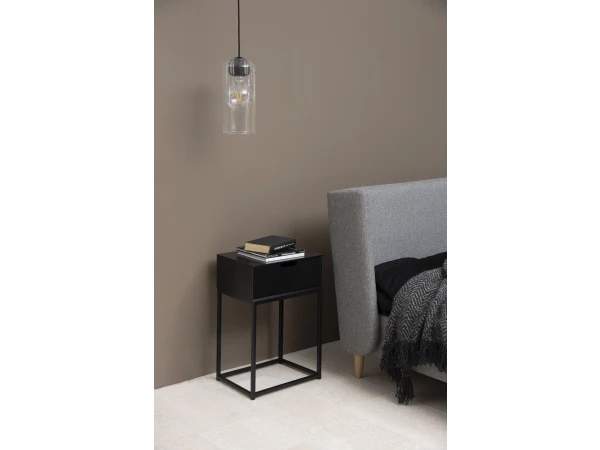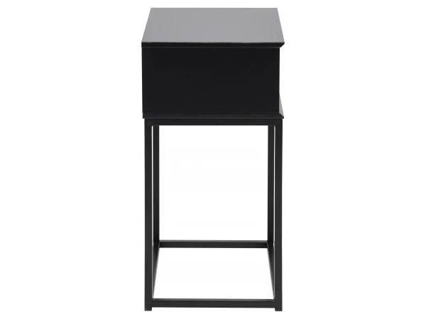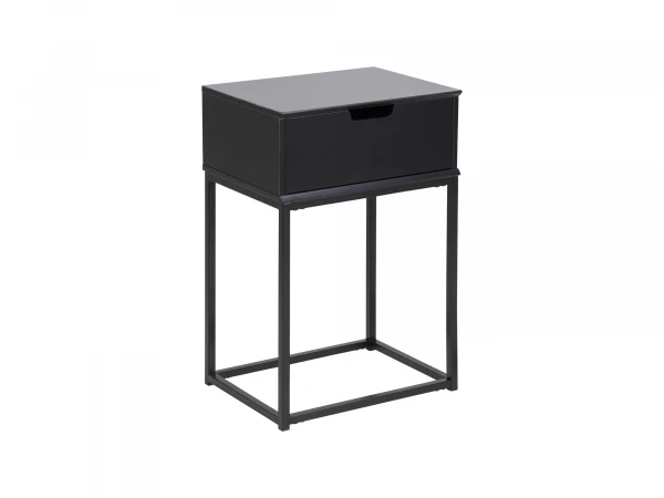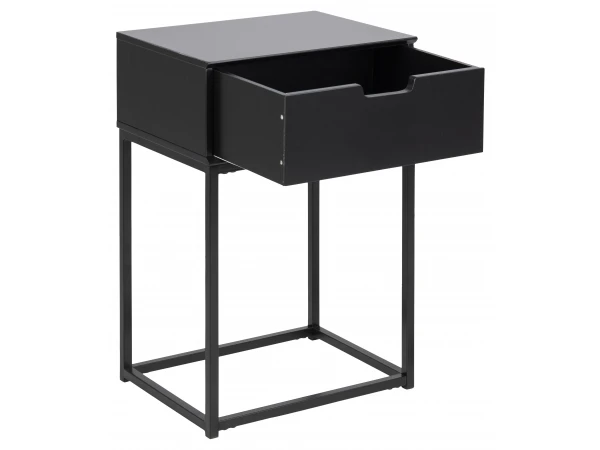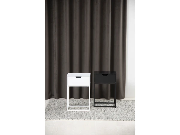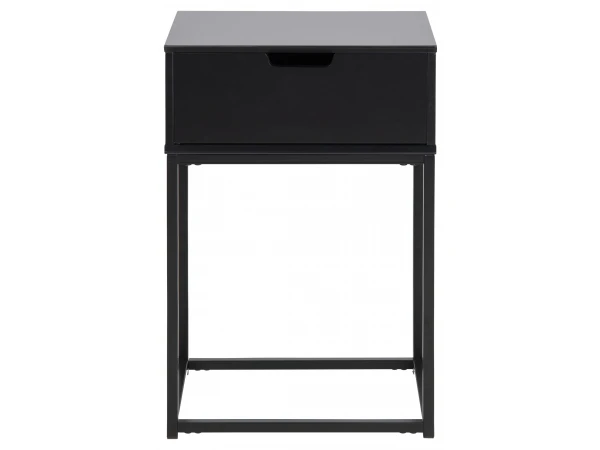 Zwart nachtkastje Mitra is een zeer stoer, compact meubel in industriële stijl. Deze nachttafel beschikt over een schuiflade en een fijn frame in metaal. Kan je makkelijk en elegant per twee of op zichzelf naast je bed plaatsen!