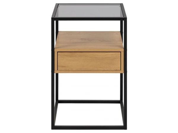 Nachtkastje Randolf heeft een strak en elegant design. Met zijn afwerking in zwart metaal en glazen topblad volgt hij de laatste interieurtrends. De nachttafel heeft een open vak en een lade voor opbergruimte.