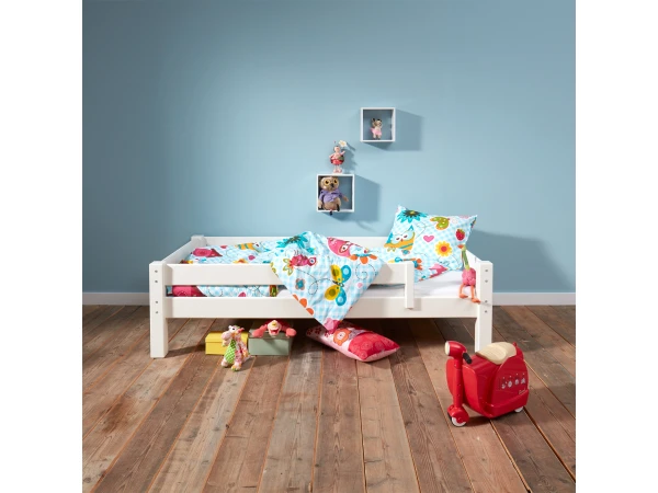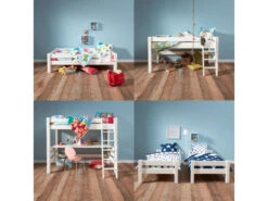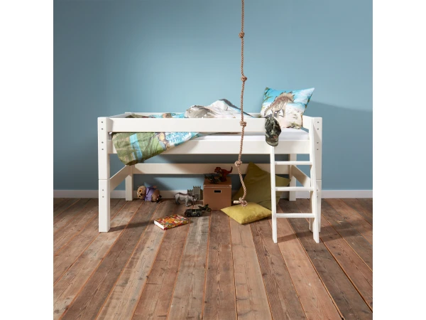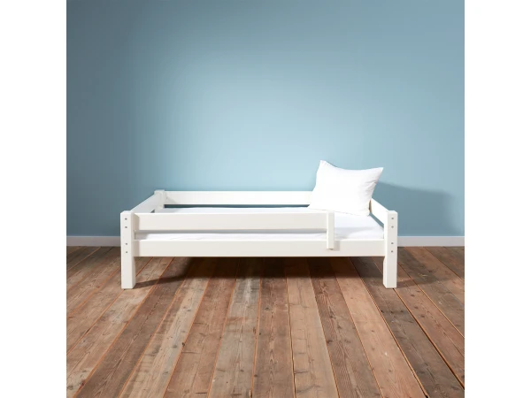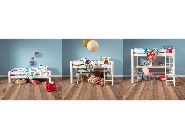 Start met het basisbed laag op de grond, met een lage instap en een uitvalbescherming om veilig te spelen en slapen. Als je kind ouder wordt kun je het ombouwen naar de halfhoogslaper, zodat hij onder het bed een leuke speel- of zithoek krijgt. Als je kind oud genoeg is kun je het bed ombouwen naar een hoogslaper met bureautafel. Indien gewenst kan het ook omgebouwd worden naar twee éénpersoonsbedden, mits aankoop van een extra lattenbodem.