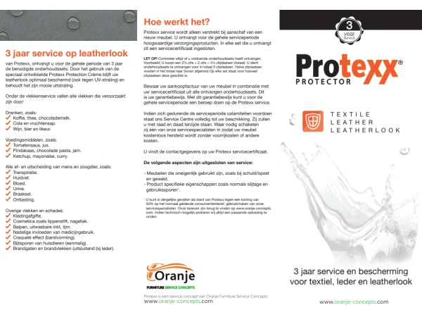 De droom van ieder persoon die een nieuwe zetel, hoeksalon of fauteuil koopt, is een vlekkeloze lange levensduur voor het meubel. Deze droom hoeft geen fictie meer te blijven. Protexx biedt de perfecte oplossing voor alle zitmeubelen gestoffeerd met leder, stof of lederlook. Jarenlange bescherming tegen snel indringen van vuil en vloeistof, gecombineerd met de professionele ondersteuning op het moment dat het even niet lukt om een vlek zelf te verwijderen. Dan komt een professionele medewerker de vlek verwijderen zonder verdere kosten.