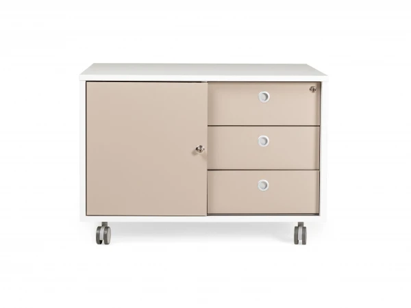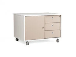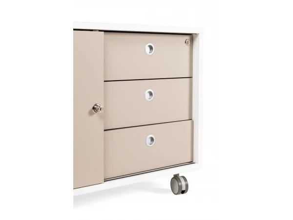 Dit kastje op wielen maakt deel uit van een compleet bureauprogramma G3 van het Italiaanse merk Gorbe. In dit bureauprogramma heb je diverse keuzemogelijkheden om je bureau, bureaukast en ladeblok samen te stellen, zowel naar afmetingen, kleuren en accessoires. Dit rolkastje is uitgevoerd in de kleuren Blanco en Arcilla, en past perfect onder het bijhorende bureau.