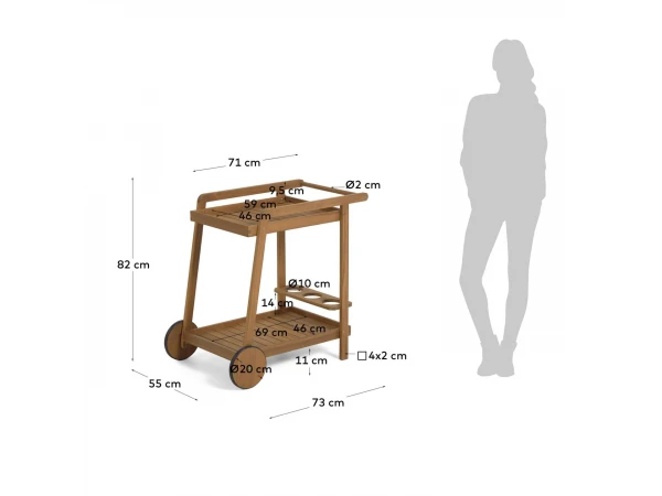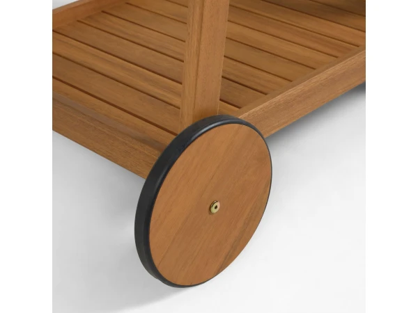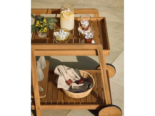 Met serveertafel Felisa heb je meteen alles bij de hand voor een geslaagde aperitief! Bespaar jezelf de tripjes naar de keuken en serveer alles wat je nodig hebt aan deze serveertafel op wielen. De serveertafel is gemaakt van massief duurzaam acaciahout en werd behandeld met olie, waardoor hij ook uiterst geschikt is voor buitengebruik. Met plaats voor enkele flessen kun je deze alvast veilig vervoeren. Bon appétit!