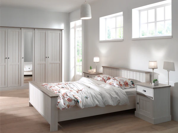 Slaapkamer ‘York’ is een slaapkamer in de landelijke stijl. De slaapkamer meubelen zijn afgewerkt in een lichte tint met bruin bovenblad, wat een mooi contrast geeft. De ‘York’ slaapkamer meubelen zijn gedetailleerd en zeer mooi afgewerkt. Deze set bestaat uit: