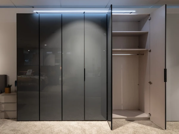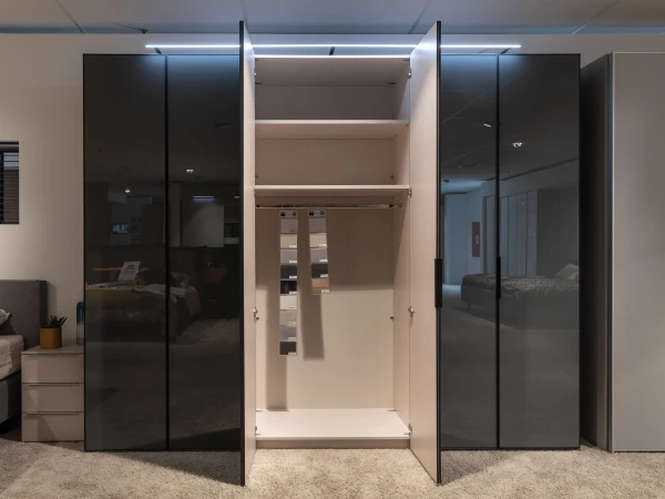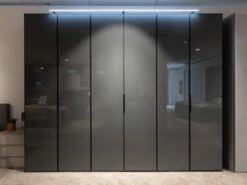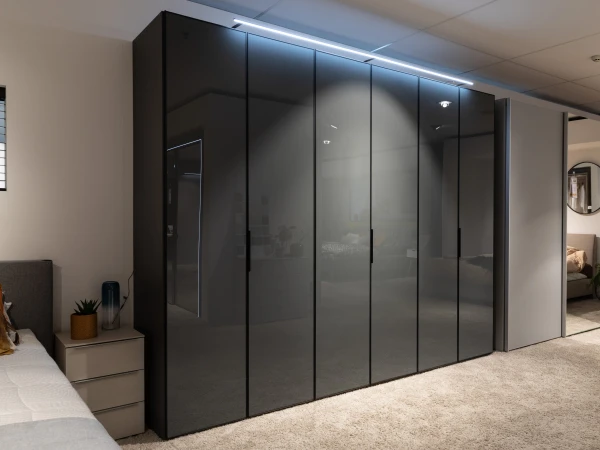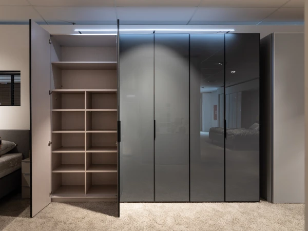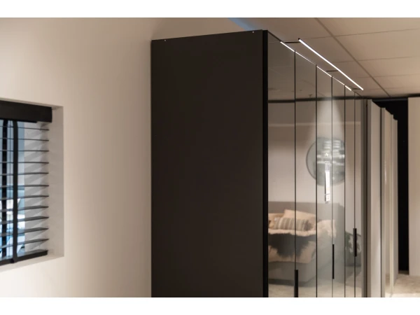 De hoogwaardige draaideurkast SWING zorgt door zijn vulkaankleurige oppervlakken en glazen fronten met matzwarte grepen voor een harmonieus geheel. Door de, populairdere kleuren, presenteert de kast zich elegant en classy. Hij straalt comfort maar ook diepte uit! Naast dit alles zijn de oppervlakken onderhoudsvriendelijk! Dit is altijd mooi meegenomen. Deze opstelling is van breedte 299 cm en van hoogte 240 cm. Dit kan je uiteraard ook aanpassen naar jouw eigen wensen. Kom voor andere afmetingen gerust eens langs in onze winkel of vraag hiernaar op onze chat! Ook de kleuren kan je aanpassen naar jouw eigen voorkeuren!