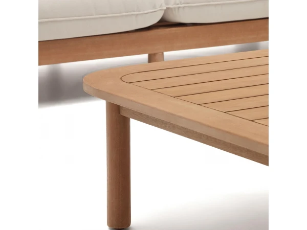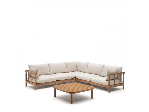 Geniet van gezellige momenten in de tuin met 5-zits hoekbank Sacova en salontafel in massief eucalyptushout! Deze prachtige tuinset van Kave Home is perfect voor lange zomeravonden en biedt voldoende ruimte voor het hele gezin en vrienden. De afneembare kussens met ronde vormen zorgen voor een comfortabele zitervaring, terwijl de neutrale en naturelle kleur van de kussens een rustieke sfeer creëren. Laat je inspireren door de moderne en stijlvolle uitstraling van deze tuinset en geef je buitenruimte de upgrade die het verdient!