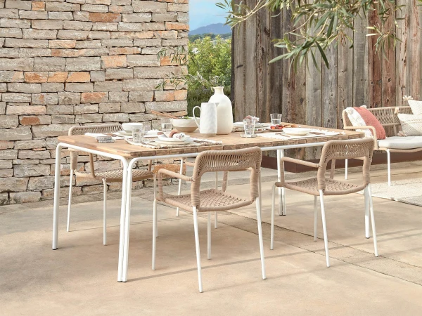 Tuinset Cailin is een exclusief ontwerp van Tapio Anttila voor Kave Home. De tuintafel is gemaakt van massief acaciahout met een gladde, natuurlijke afwerking. De tuinstoelen zijn een ware blikvanger voor je terras, met een uniek design van handgeweven beige koord. De wit gelakte poten van gegalvaniseerd staal zijn bestand tegen roest, corrosie en UV-stralen. De tuintafel draagt het Kave Cares Design: FSC-gecertificeerd hout afkomstig uit duurzaam bosbeheer met gecontroleerde houtkap. Combineer met de andere tuinmeubelen uit de Cailin-collectie voor een samenhangend geheel.